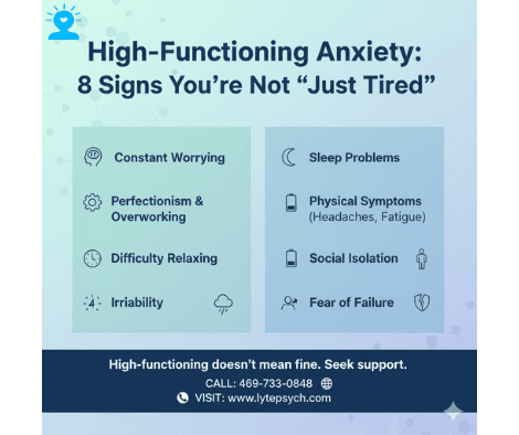 At Lyte Psychiatry, serving Dallas & Arlington, TX, our psychiatrists and therapists help both adults and adolescents recognize the signs of high-functioning anxiety and find healthier ways to cope.