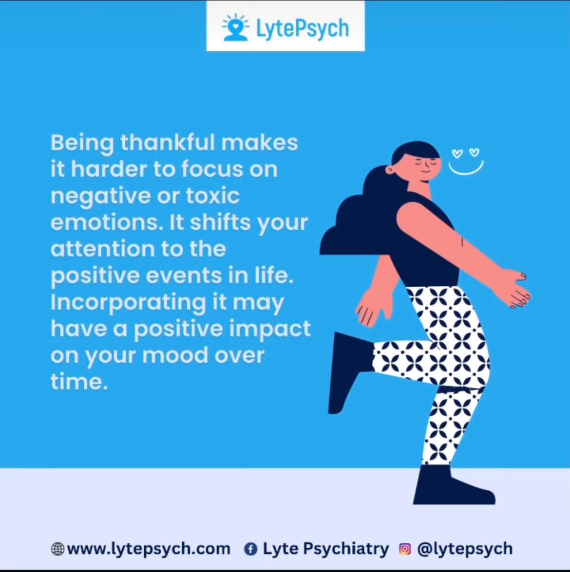 Furthermore, being thankful makes it harder to focus on our failures, weakness and negative or toxic emotions. It shifts our attention to the positive events in life, the wins, the great decisions. If you need to consult or speak with the best psychiatrist, mental health nurse practitioner, or therapist click the link http://bit.ly/3V0JaSv to schedule an appointment with us today.